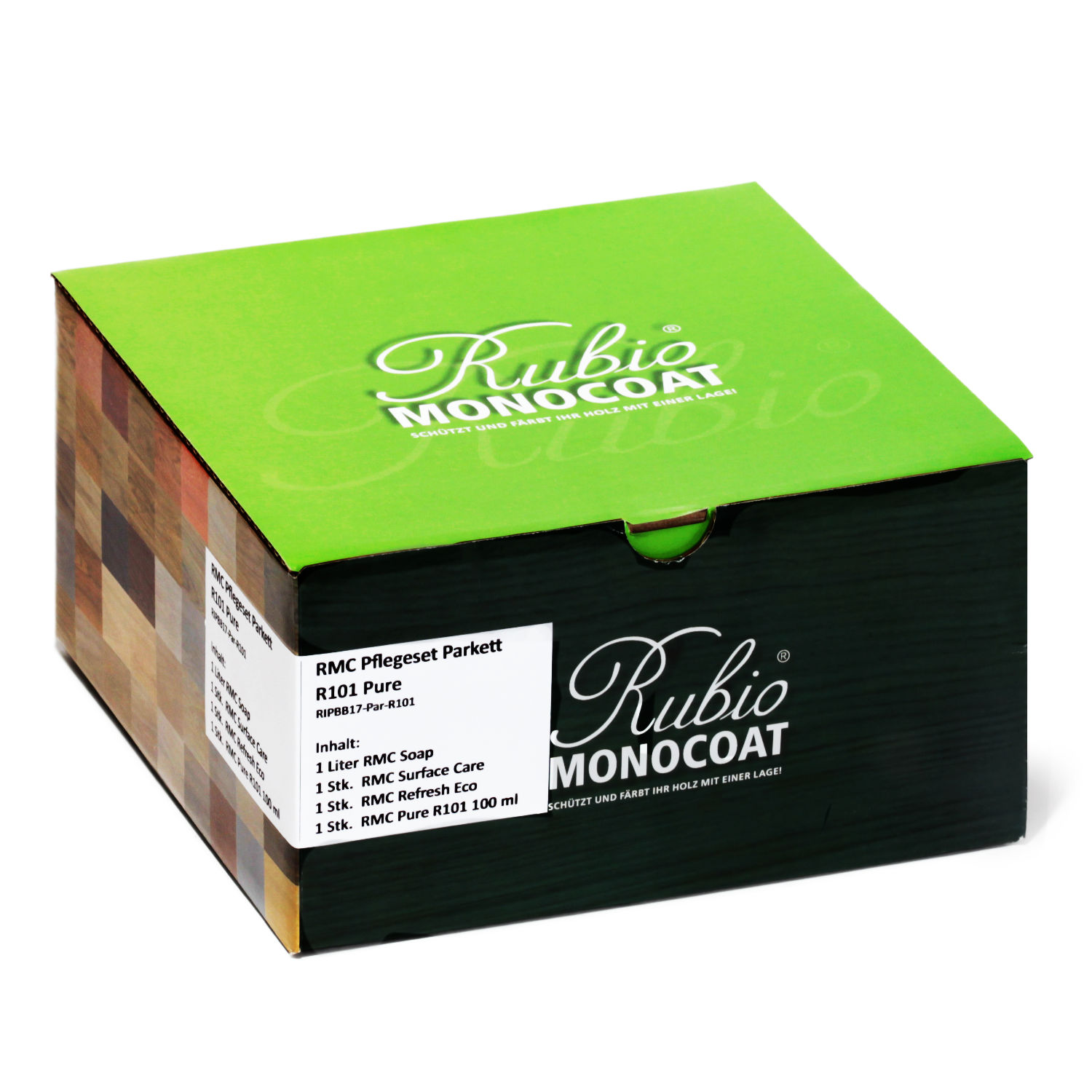 In der RMC Pflegebox für Parkettböden finden Sie verschiedene Reinigungs- und Pflegeprodukte vor, die Sie mit einer Grundausstattung für den Unterhalt Ihres geölten Parkettbodens versorgt. Die Box enthält alle notwendigen Produkte für Reinigung, Auffrischung und Pflege.